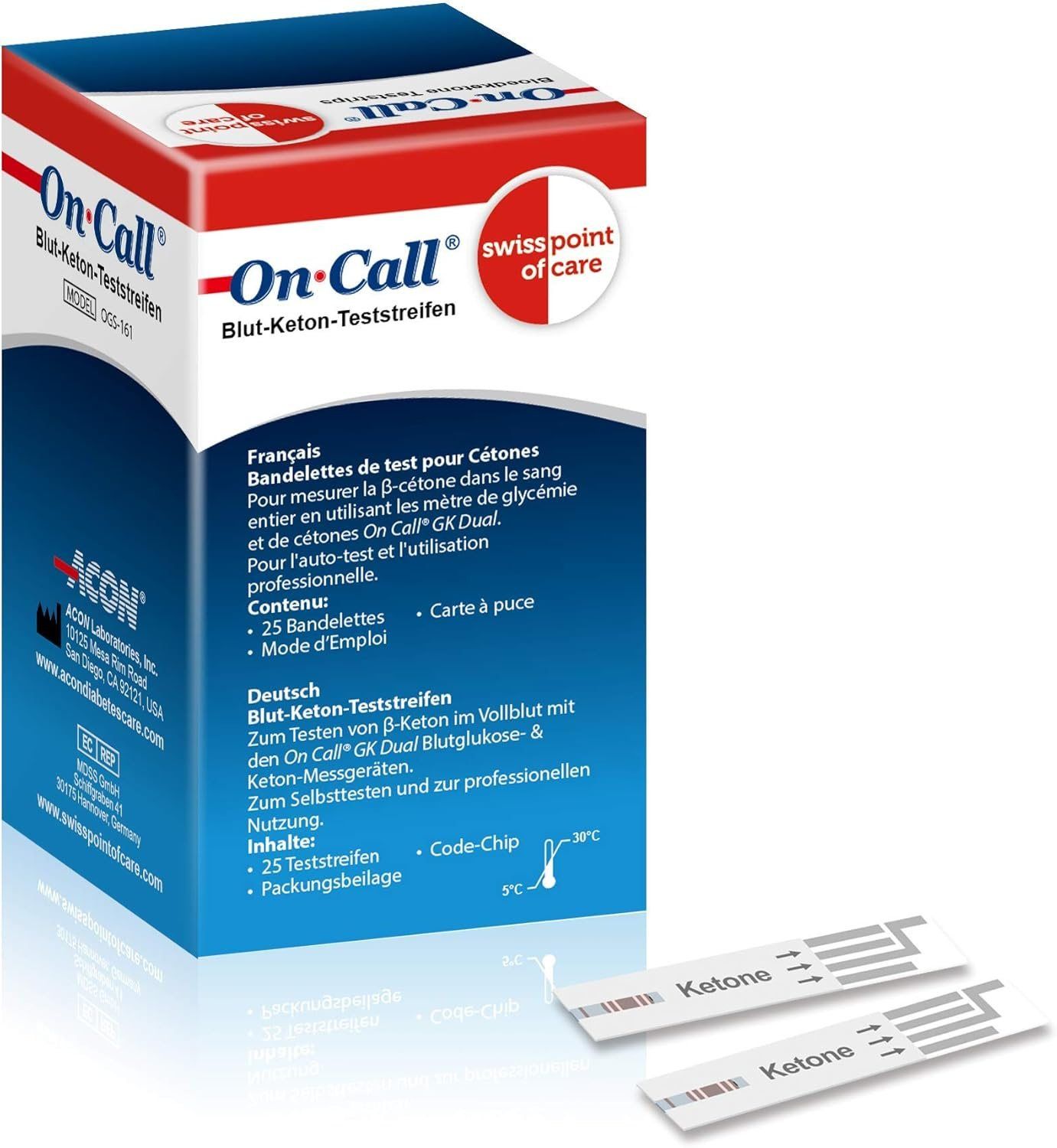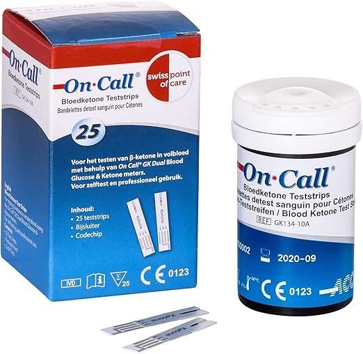 On Call GK Lot de 25 bandelettes de test double cétone – Compatible avec les appareils de mesure GK Dual de On Call et Swiss Point Of Care ainsi que pour les appareils de mesure Go-Keto Ketone