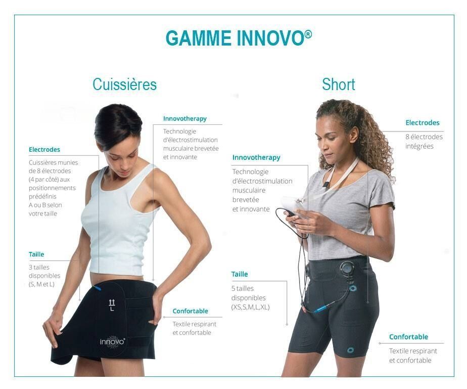 La technologie Innovotherapy envoie des signaux multidirectionnels via huit électrodes judicieusement intégrées à l’intérieur du short INNOVO® ou des cuissardes permettant de contracter l’ensemble des muscles du plancher pelvien.